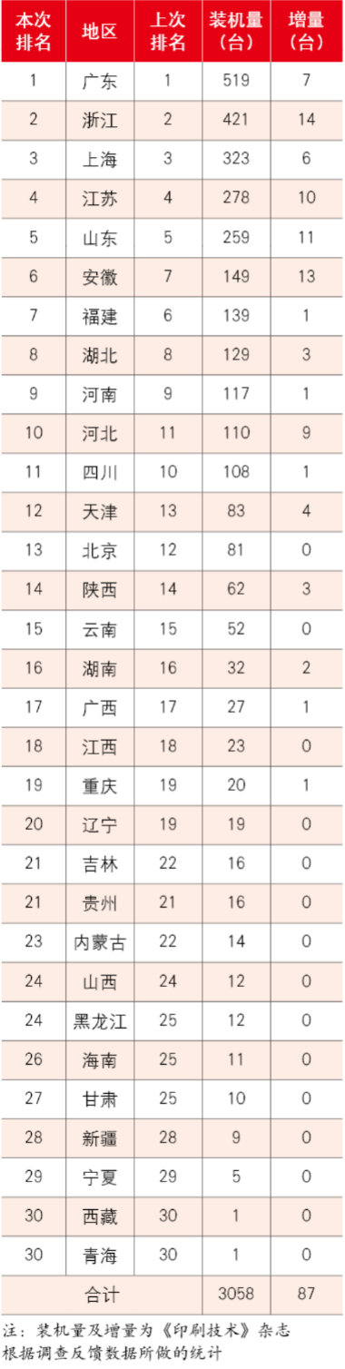 表2 2023年機(jī)組式柔性版印刷機(jī)地區(qū)裝機(jī)量、增量及排名
