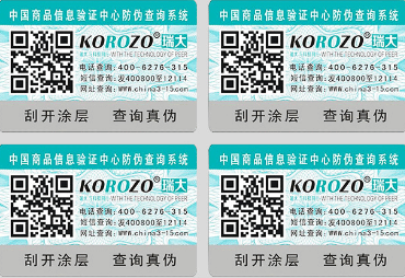 數(shù)碼刮開式防偽標簽是在紙面標簽的基礎上,噴印數(shù)碼信然后再以特種油墨覆蓋印制而成。數(shù)碼防偽標簽分面層、次層、黏膜層、底層四部分,面層是可去除銀粉薄膜,能夠印刷文字、圖案;次層是有色或白色銅版紙或易碎紙,印有防偽身份碼;黏膜層為久標識膠;底層為用于防粘的離型紙。