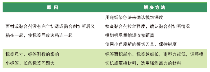 所謂模切掉標(又稱飛標),是指在模切過程中不干膠標簽隨著排廢被帶起來的現(xiàn)象。在模切排廢過程中,不干膠材料離型力過低、模切處膠黏劑回黏、模切刀有破損或接口不齊等原因都會引起模切掉標問題,嚴重的模切掉標現(xiàn)象不僅會造成原材料浪費,還會給后工序帶來許多麻煩。那么,究竟該怎樣降低模切飛標問題的產生呢?